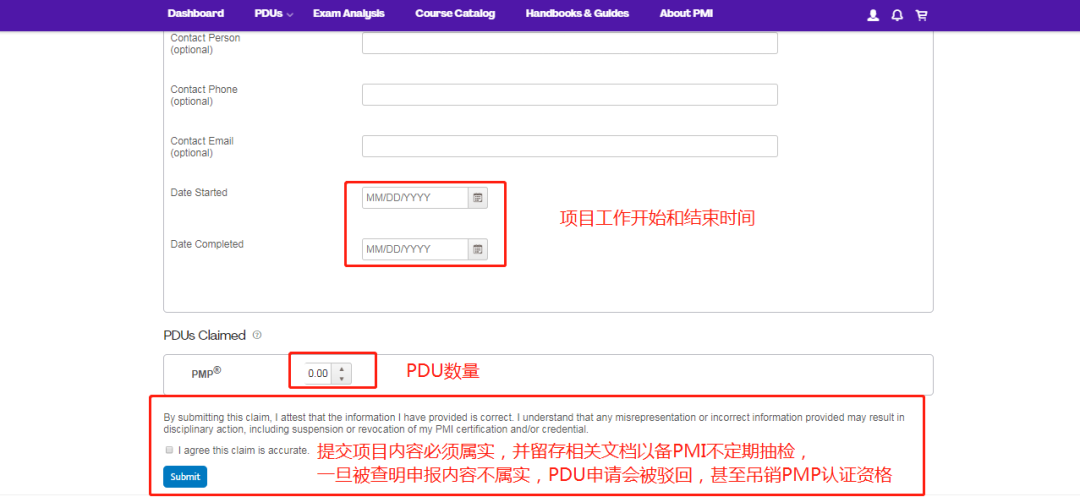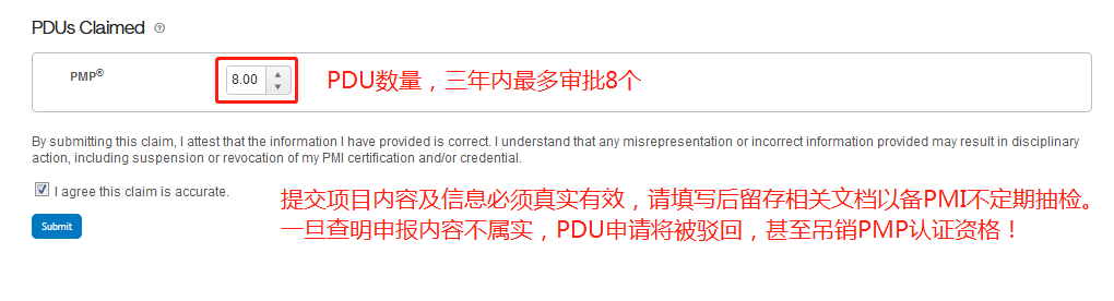 提交项目内容必须属实,请做好申报项目的文档留存--PMI抽检一旦被查实经验不属实,会驳回PDU申请,甚至吊销PMP认证资格,所以申报需以实际项目为准,并留存必要的项目文档以备抽检。